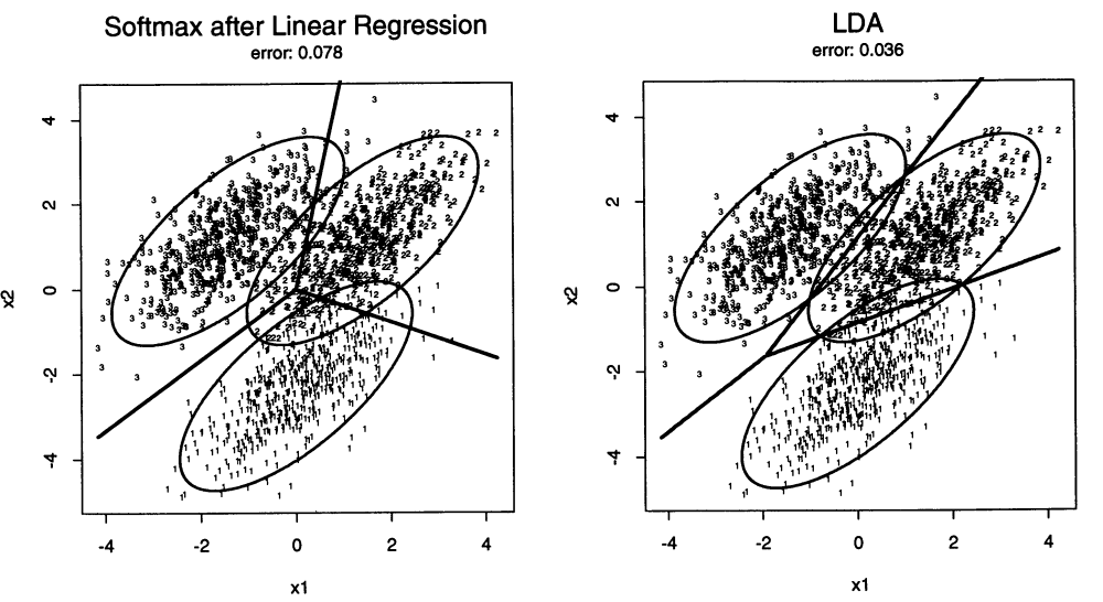 centriod가 colinear하게 배치되어 클래스 2의 centriod \(\hat{\mu}_2 = 0\)이고, 클래스 2기준으로 양쪽 클래스 1,3에 거의 동일한 \(-\hat{\mu}_k^T\Sigma_T^{-1}\hat{\mu}_k\) 항이 더해졌기에 masking effect가 발생하였다. 마찬가지로 LDA에서는 이러한 문제가 발생하지 않았다.